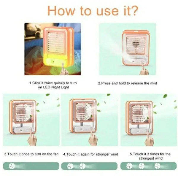 Easy to Use: portable cooling fan is activated by touch sensor.3 available speeds: touch it once for weak airflow, touch it twice for strong airflow, touch it again for stronger airflow, turn the fan off by touching it for the 4th time. Fast double touch to turn on the led night light. Long touch for mist spray. Equipped with 80 degree adjustable shutters to adjust the direction of airflow.